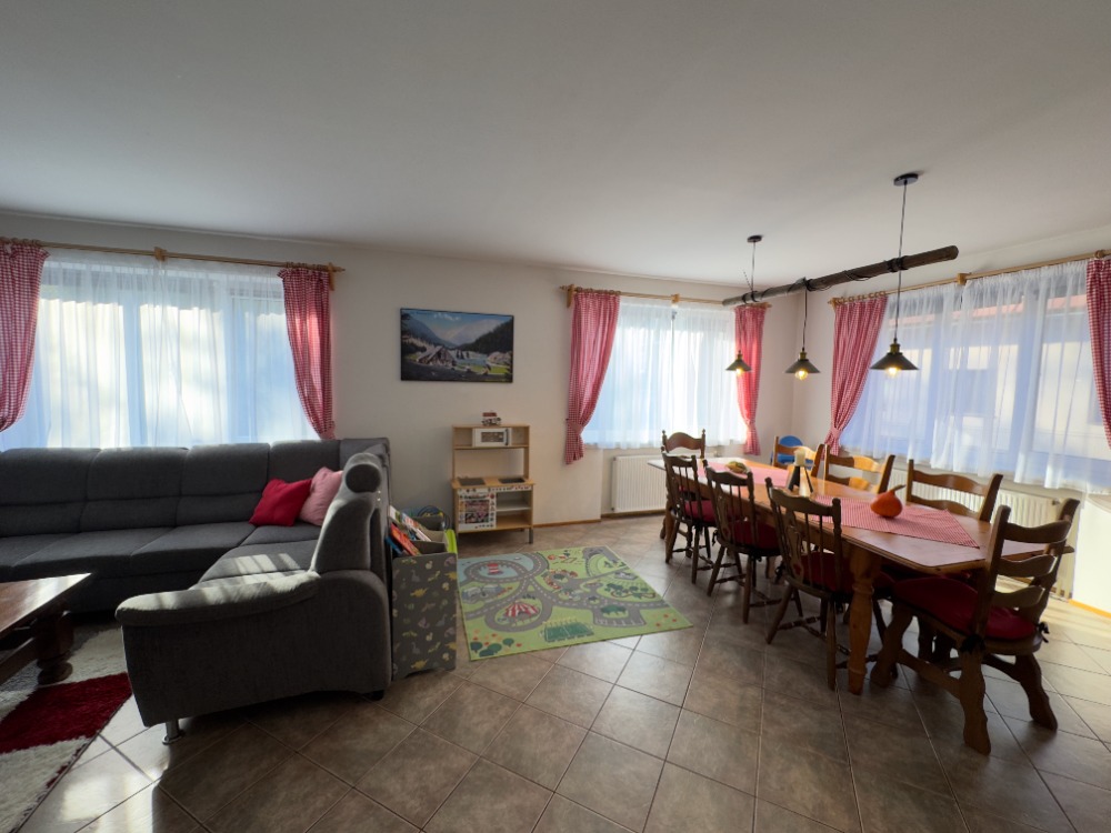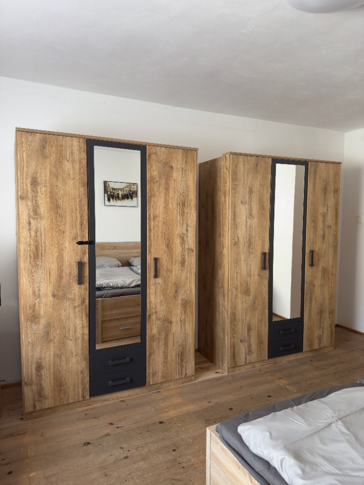 On the upper floor of the cottage, there are two spacious rooms with a double bed and the option of an extra bed, as well as three rooms with two single beds. Thanks to the combination of wooden elements and attic ceilings, the space offers a cozy mountain atmosphere, ideal for families and groups of friends. The floor also includes a large bathroom with a bathtub, shower, two sinks, and a toilet, providing plenty of comfort even for a larger number of guests.